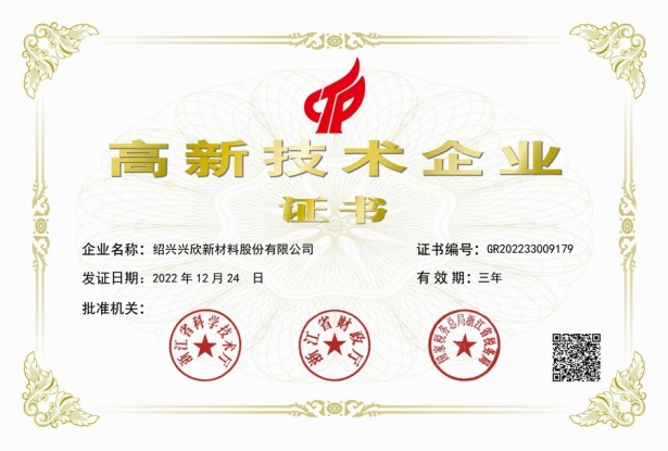 紹興興欣新材料股份有限公司成立于2002年06月27日,占地面積122畝,位于杭州灣上虞經(jīng)濟(jì)技術(shù)開(kāi)發(fā)區(qū)拓展路2號(hào),現(xiàn)有職工200余人,專業(yè)技術(shù)人員50余人;博士、碩士研究生30余人組成的一支知識(shí)型、專業(yè)化的技術(shù)科研團(tuán)隊(duì)。公司面向全球市場(chǎng),專業(yè)開(kāi)發(fā)電子化學(xué)品、環(huán)保化學(xué)品、醫(yī)藥中間體、高分子材料等先進(jìn)新材料重點(diǎn)領(lǐng)域的省級(jí)科技型企業(yè);建有浙江上虞、安徽東至兩個(gè)生產(chǎn)基地。目前為“國(guó)家高新技術(shù)企業(yè)”、浙江省“隱形冠軍”企業(yè)、浙江省專精特新中小企業(yè);建有“省級(jí)”研究開(kāi)發(fā)中心,共建天津大學(xué)浙江紹興研究院電子化學(xué)品研發(fā)中心。
